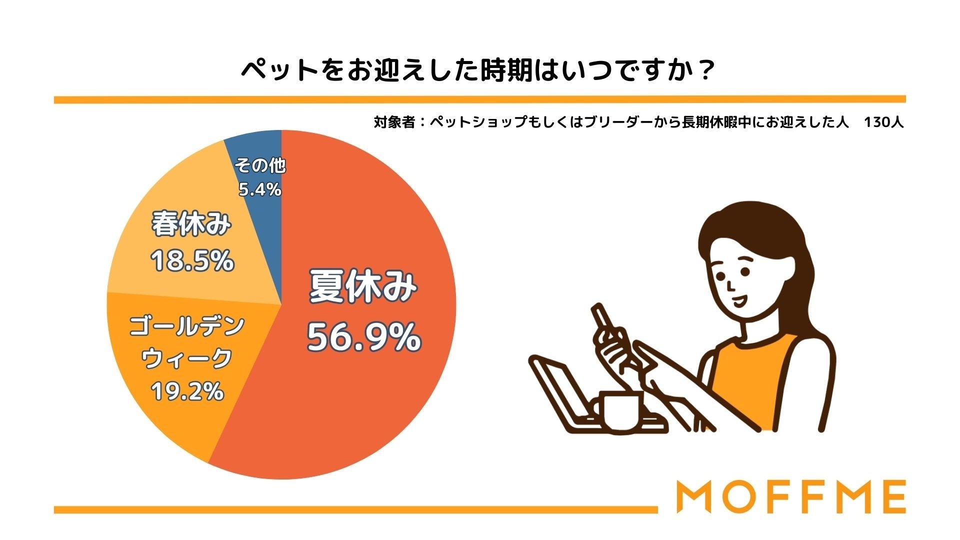 前設問の長期期間中にお迎えしたと回答した130名に、具体的にどのタイミングでお迎えしたかを調査した所、「夏休み」が56.9%と圧倒的に多い結果となりました。