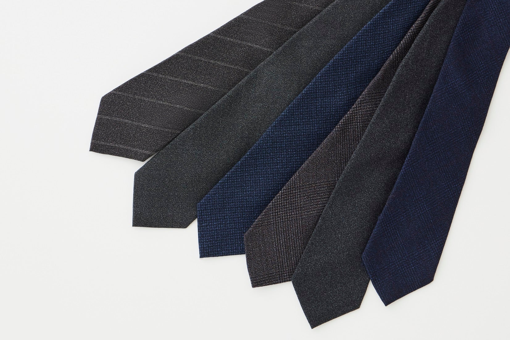 色柄は、無地の「グレー」と「カーキ」、チョークストライプの「グレー」、グレンチェックの「ネイビー」と「ブラウン」、ハウンドトゥースの「ネイビー」の、計6種類となります。同素材のネクタイも展開いたします。