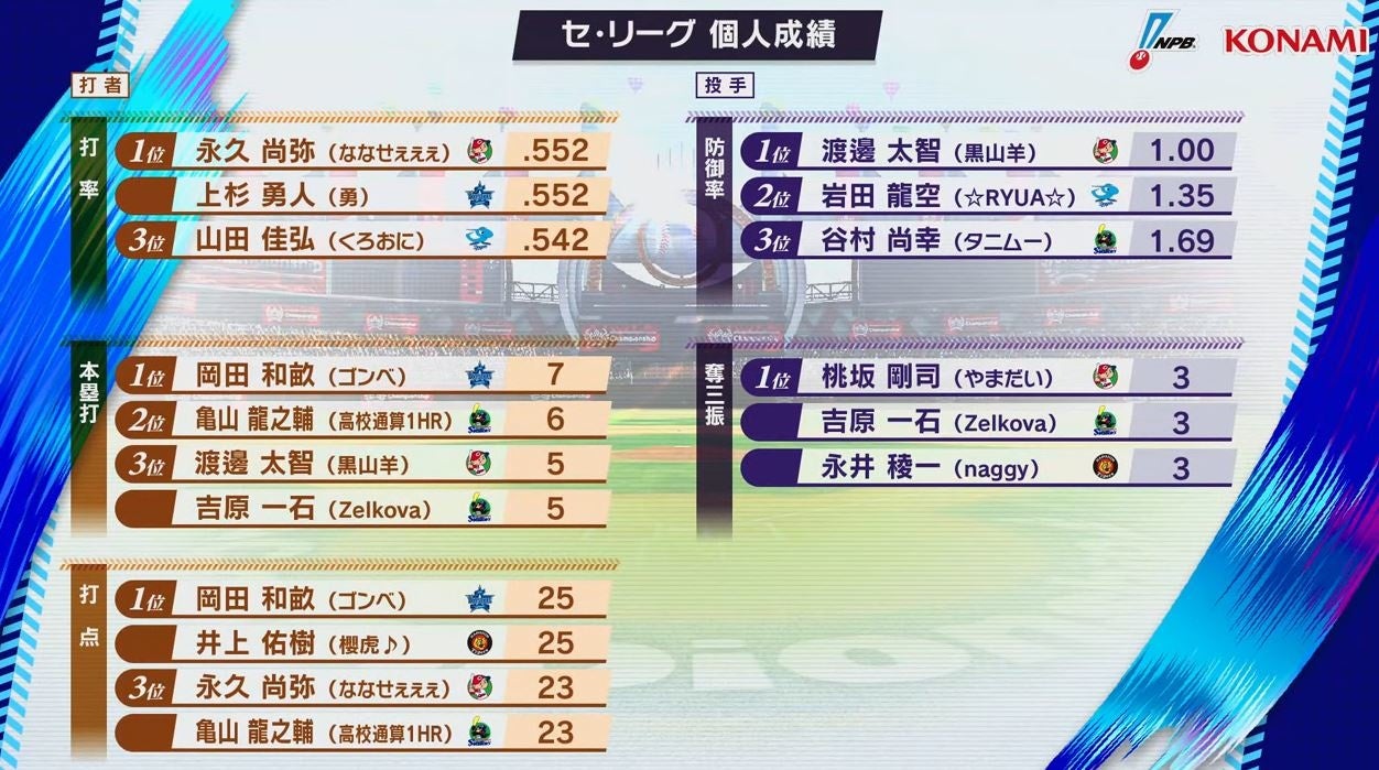 eペナントレースの全試合終了し、各タイトル(首位打者/本塁打王/打点王/最優秀防御率/最多奪三振)の獲得選手と各リーグ(セ・リーグ/パ・リーグ)の優勝チームが決定しました。各受賞は以下の通りとなります。