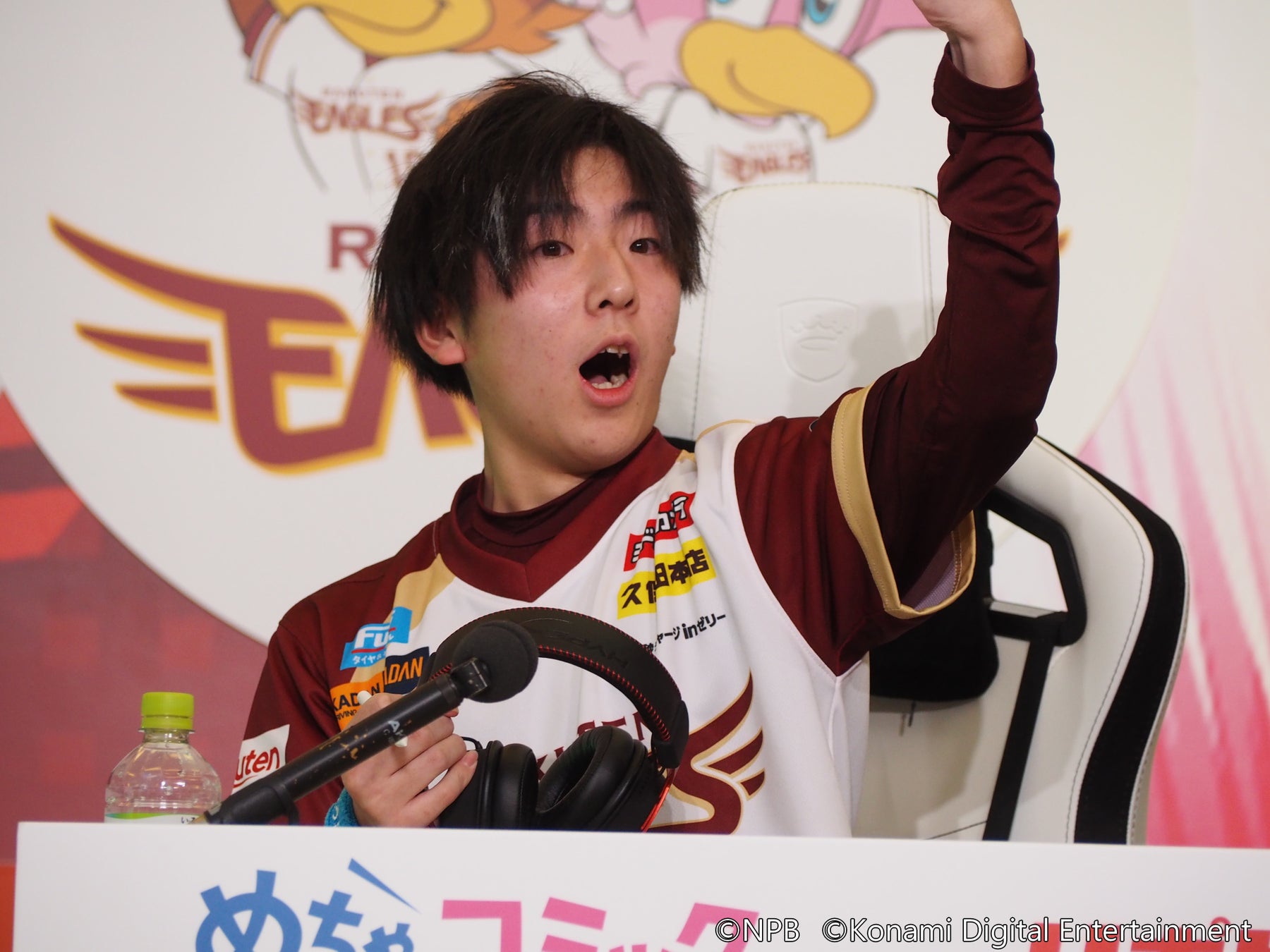 「eBASEBALL プロリーグ」(※)を見てこの舞台に立ちたいと思ってやってきた。スピリーグの初年度から選手として参加させてもらって優勝できるのは最高です。チームメイトの二人の負担が大きくなったところで支えてもらって、今日の優勝があるのかなと思います。