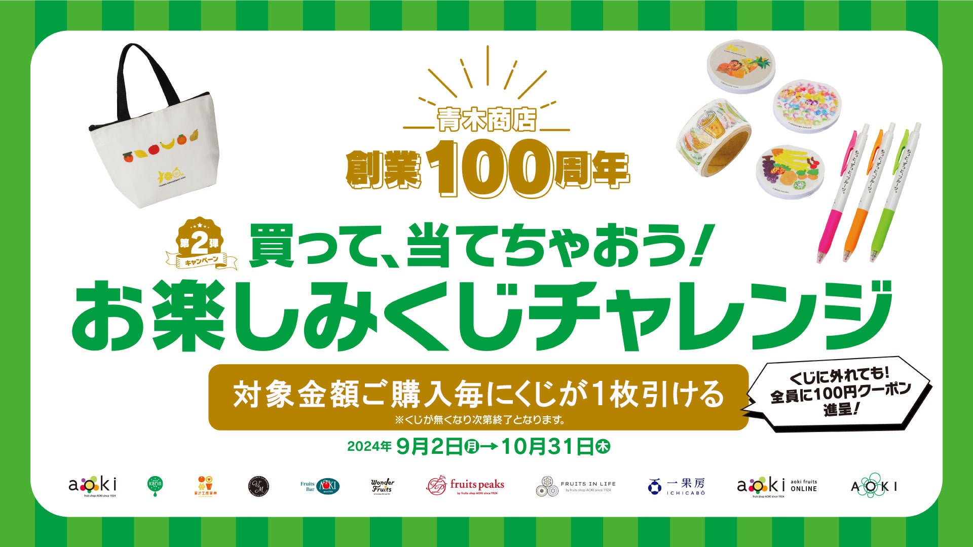株式会社青木商店(本社:福島県郡山市、代表取締役社長:青木大輔、以下青木商店)は、創業100周年を記念し、2024年9月2日(月)から2024年10月31日(木)までの期間限定で、青木商店全ブランドの店頭で対象金額購入毎にくじが引けるキャンペーン『買って、当てちゃおう!お楽しみくじチャレンジ』を実施いたします。