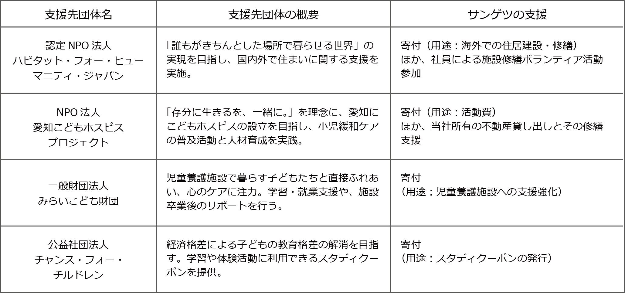 この目標に基づき、当社は支援先候補について社員から意見を募った上で、各団体の理念や活動方針に関するヒアリング等を通じた検討を重ね、支援先として下記の4団体を選定しました。当社は今後、幅広い地域で専門的な知識や経験を持ち活動する団体へ継続的な寄付を行い、各団体と共に課題解決に取り組みます。さらに、社員自らが自発的にボランティア等に参加することで、これまで以上に積極的な社会参画活動を行ってまいります。