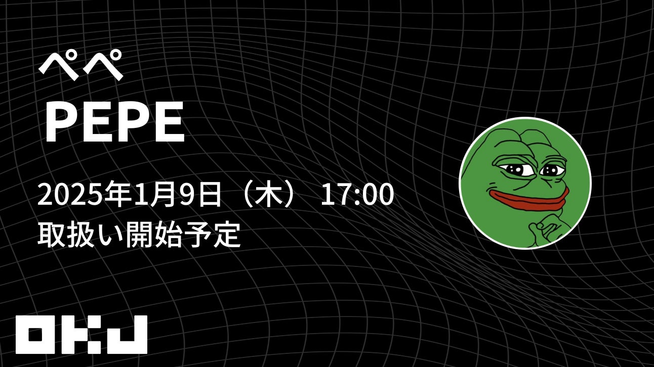 OKJは、『ぺぺ(PEPE)』を、2025年1月9日(木)に取扱い開始することをお知らせいたします。これにより、OKJは、44種類の暗号資産を取扱うことになります。また、2024年12月25日時点で、ぺぺ(PEPE)の板取引、入出庫での取扱いは国内初となります(※自社調べ)