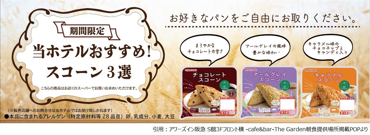 アワーズイン阪急様では、ご宿泊されたお客様に、S館3Fフロント横、-cafe&bar-The Gardenにて、毎朝焼き上げたパンをご提供されております。2023年10月14日(土)より※1、期間限定で、パンと一緒に当社スコーン3種をご提供いただいております。是非この期間に当社スコーンをお召しあがりくださいませ。ご提供するスコーンには限りがございます。ご来店頂く時間帯によっては品切れとなっている場合がございますので予めご了承ください。