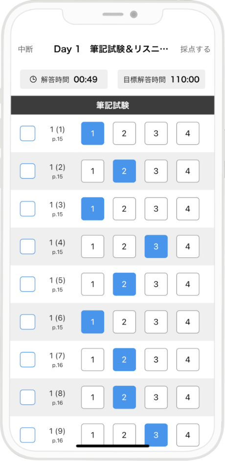 オンラインマークシートに解答をタップで入力し、「採点する」を選択すると瞬時に採点結果が表示されます。リスニング問題は、再生ボタンのタップで音声が流れるため、音声ソフトなどで別に再生する手間がありません。記述式などの一部の問題は、模範解答例が表示されるので、自己採点が可能です。シンプルな操作で、採点結果を把握し、履歴を残すことができ、とても便利です。