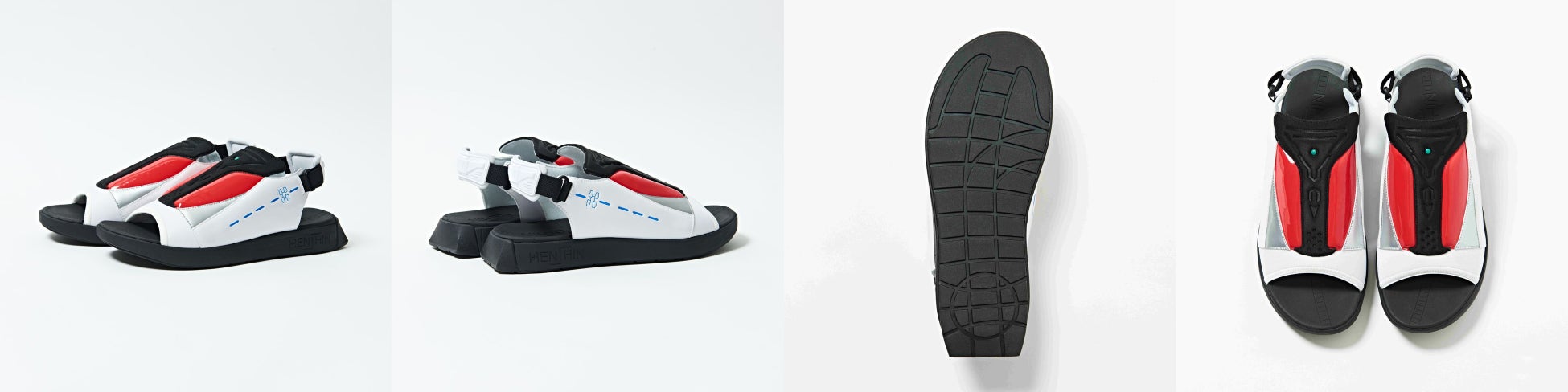 時の列車『デンライナー』をモチーフにデザインされたサンダルは、『仮面ライダー電王』の公式足跡デザインをアウトソールにて再現しています。