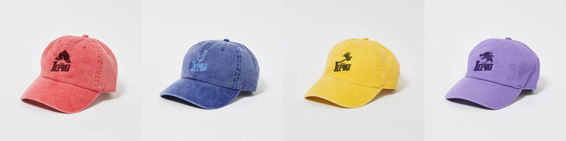 ICEタロスのオリジナルロゴと、イマジン4つの個性を「桃」「釣り針」「斧」「竜」のマークにそれぞれ落とし込んだPOPなデザインをフロントに大胆に刺繍したキャップは、ピグメント加工を施すなど、ビンテージな味わいを出したアイテムとなっています。