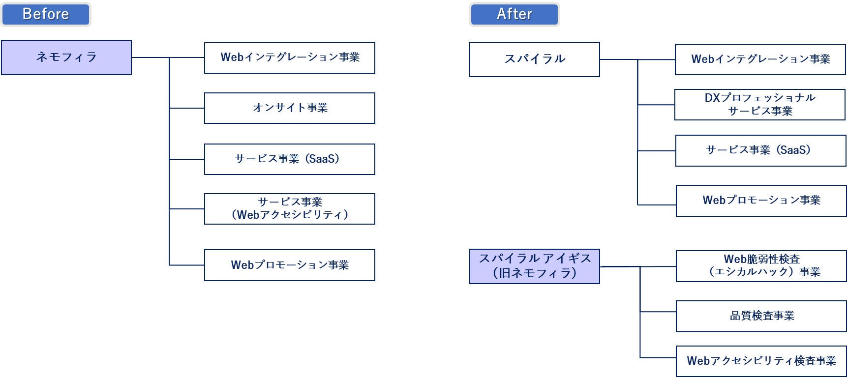 このたび、グループシナジーの最大化およびグループ経営戦略の遂行を加速させることを目的として、ネモフィラの営むWebインテグレーション事業、Webプロモーション事業およびサービス事業のうちSaaS事業を吸収分割により当社に承継することといたしました。併せて、ネモフィラは検査事業に特化した会社として、「スパイラル アイギス株式会社」と社名を変更することとなりました。