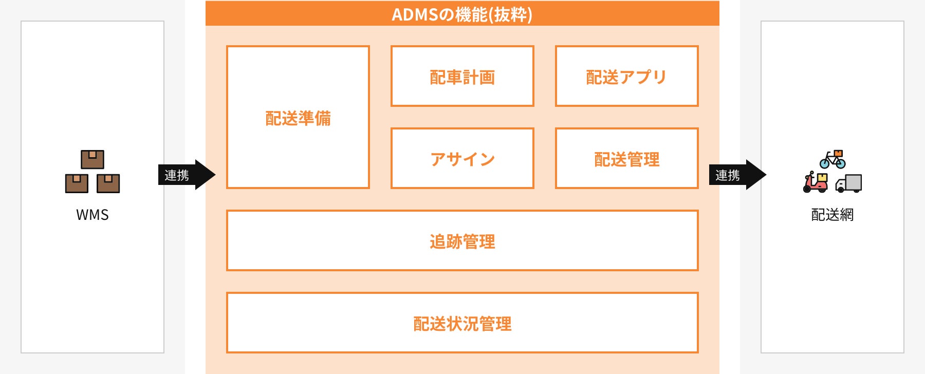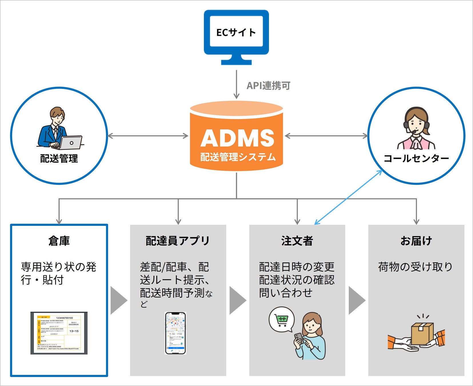 ADMSを導入することで注文からお届け完了までの一連の業務を倉庫や配達員、コールセンターなど、関係者で共有することができ、効率向上を実現します。具体的には、倉庫での専用送り状の発行・貼付、配車割り当て、配送ルート算出、配達員アプリへの指示、そして追跡・配達状況管理が可能です。