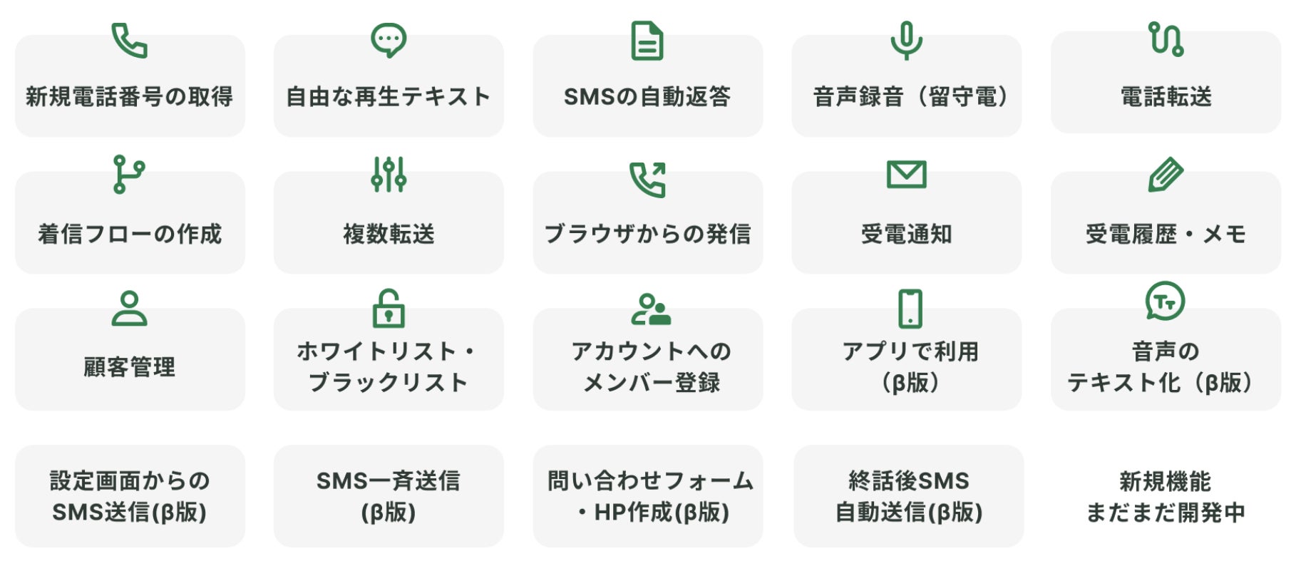 サービスの機能として、電話応答の分岐を自由に設定でき、AI自動応答やSMS返信・電話転送・アプリ転送・顧客管理(CRM)など、フロントオフィスの業務を支える機能を幅広く利用可能です。