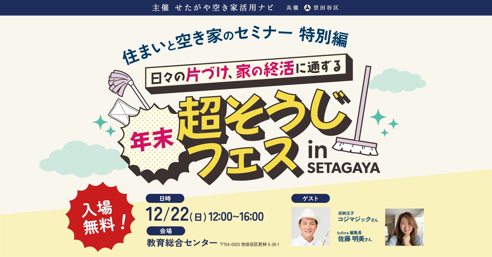 【12/22開催/参加費無料】「年末超そうじフェス in SETAGAYA」 住まいや空き家の悩みを解決するセミナーイベント!収納王子コジマジックさんの収納術トークやワークショップを、家族で楽しんで!