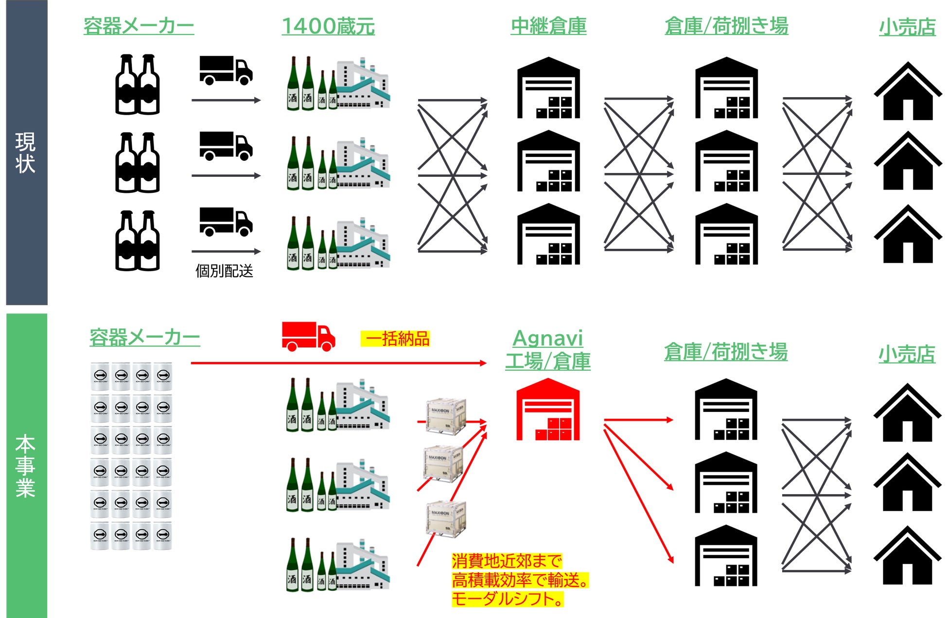 Agnavi is promoting its original Japanese SAKE brand, Canpai🄬 as well as ICHI-GO-CAN®, both of which are all 180mL (=1 go) canned SAKE for consumers to enjoy 'smaller size,' 'stylish,' and 'handy' alcoholic beverages. Agnavi intends to increase grobal SAKE consumption, as spreading attractions of local SAKE breweries no matter what production sizes, as all brands nationwide put together into ICHI-GO-CAN. Currently, almost 200 brands all over Japan are available. Agnavi is accelerating to achieve our goals, to become a game-changer for all local and traditional SAKE breweries enable to achieve their business stable and sustainable, to construct SAKE's supply-chain providing various Sakes at one-stop distribution channel. Also, Agnavi shall continue challenging to create new markets, where to innovate SAKE lovers' lifestyle.