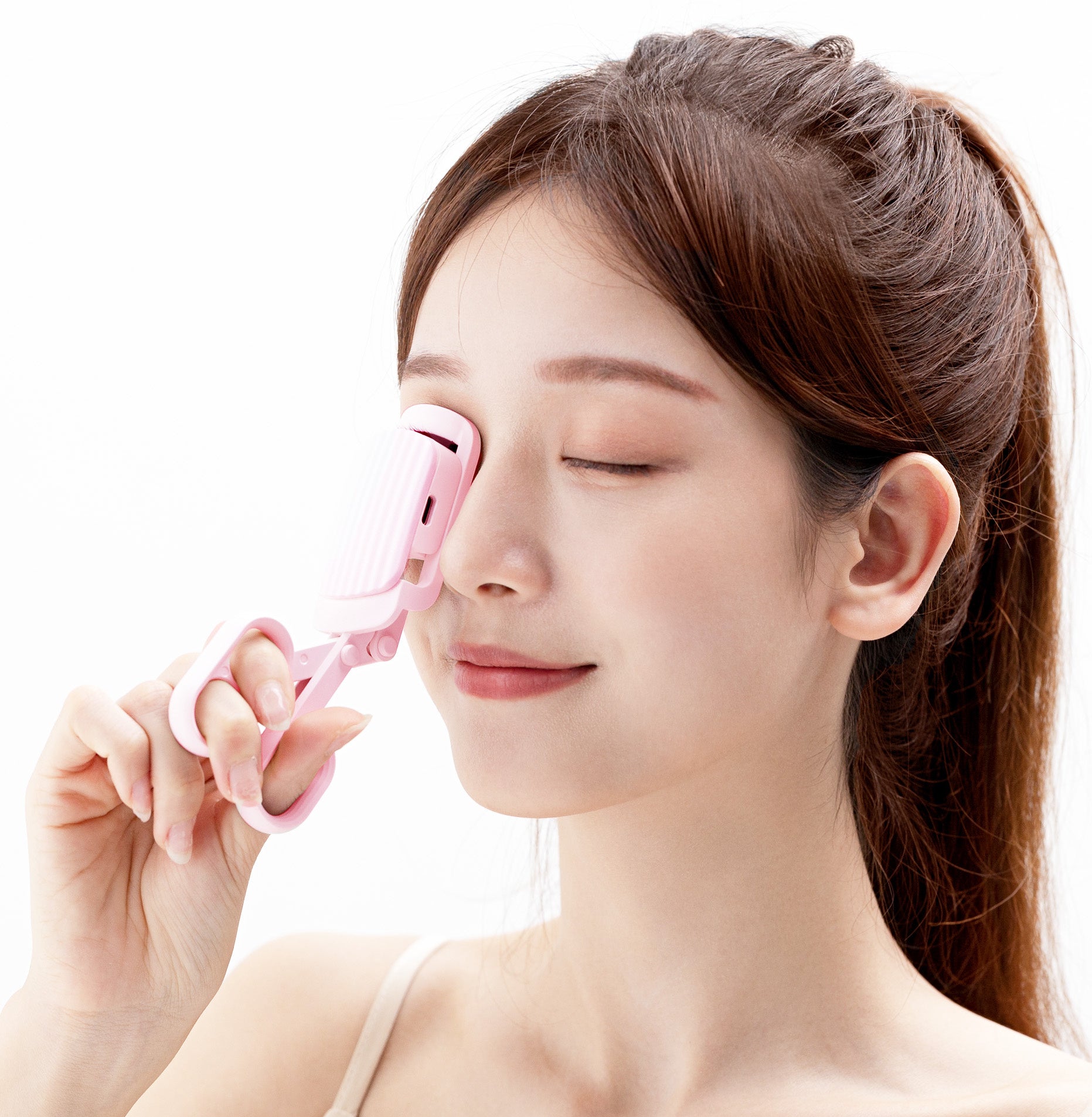 カーラーとホットビューラーの手順が一度で可能な粧美堂の「はさんであがるヒートカーラー」。まつげをしっかりホールドしながら熱を加え、くるんと上向きにします。