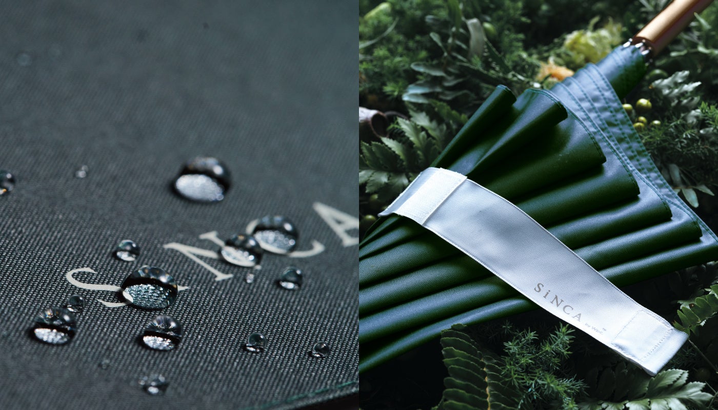 SiNCAの生地は、はっ水力が持続する継続はっ水性と耐水圧10,000mmH2O以上の高性能で雨の日のストレスを軽減します。また、生地裏面にポリウレタン樹脂の多層コーティングを施すことで、遮光100%、UVカット率99.9%、UPF50+(最高格付け値)、遮熱性能と日傘として必要なスペックもハイレベルで兼ね備えています。長く快適にご使用いただけるよう、全てにおいて妥協せず開発しました。
