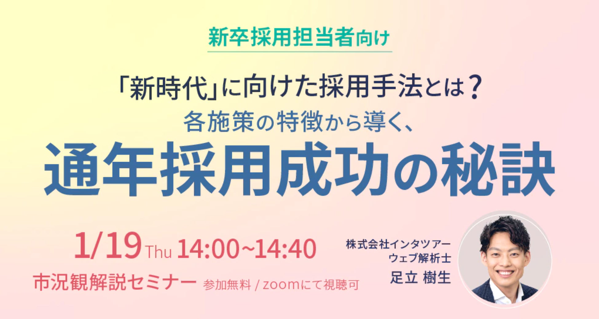 HRテクノロジーでサービスを展開するキャムコムグループ傘下で、新卒採用向けのリレーション採用プラットフォームを提供する(株)インタツアー(代表:作馬 誠大、本社:東京都港区浜松町)は、2022年1月19日(木)に、新卒採用担当者向けオンラインセミナー『『新時代』に向けた採用手法とは?~各施策の特徴から導く、通年採用成功の秘訣~』を開催いたします。