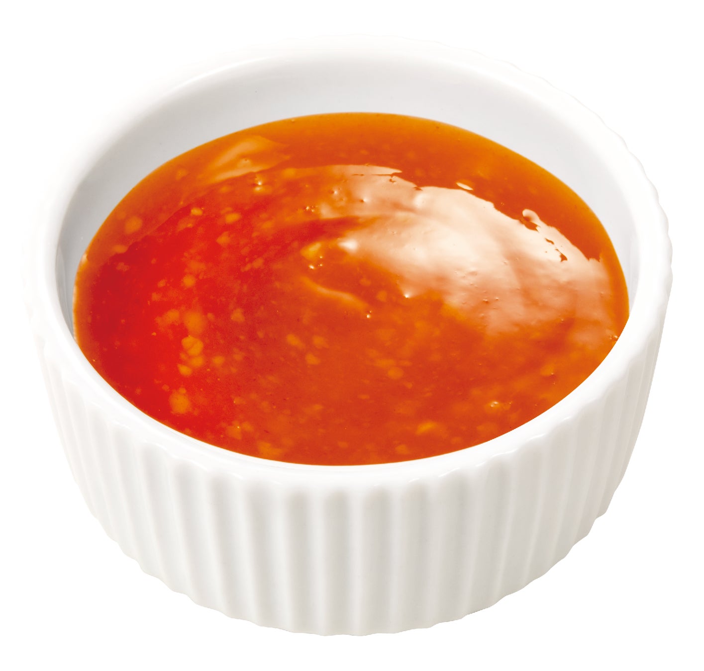 ピリッとした辛みと甘み、そして酸味をバランスよく仕上げました。にんにくの風味も楽しめる、クセになるエスニックテイストなソースです。