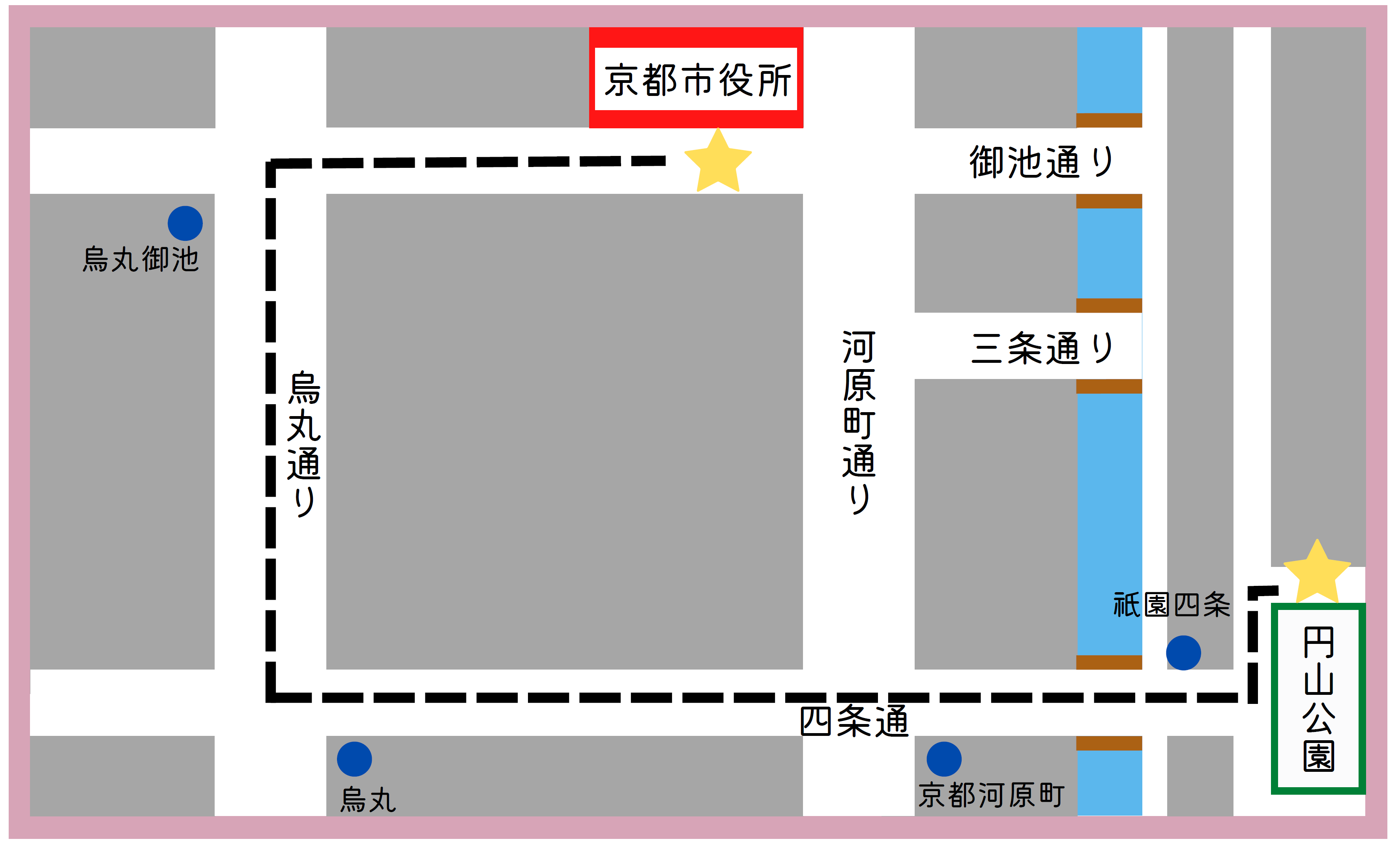 道順:(集合場所)京都市役所前広場,京都市役所前から西→烏丸御池を南下→四条通を東→円山公園
