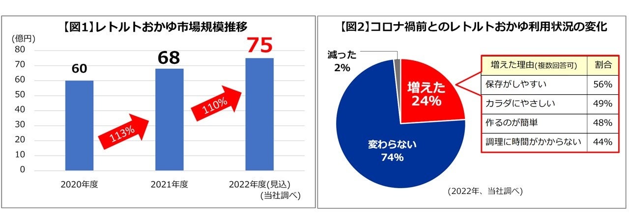 しかし2021年度以降、コロナ禍による健康志向や常備品需要増加などの影響を受けて、市場は大きく伸長しています(図1参照)。また昨年当社が実施した「味の素KKおかゆ」シリーズのユーザーに対する調査によると、コロナ禍を経て“保存がしやすい”“カラダにやさしい”“即食性・簡便性”などの特長が再認識されたことで、体調不良時のみならず、毎日の食事としてレトルトおかゆが利用される機会が増えたことがわかりました(図2参照)。