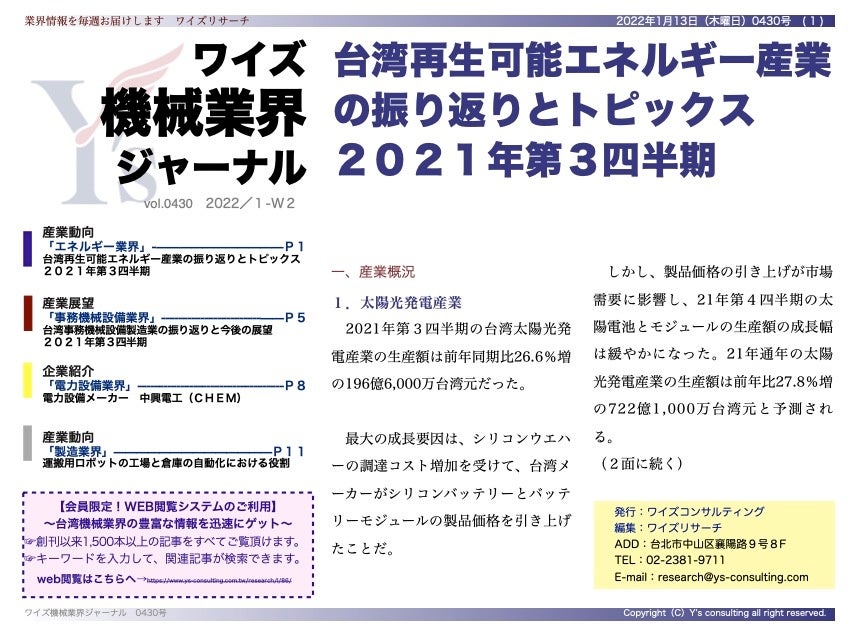 2021年第3四半期台湾再生可能エネルギー産業の振り返りとトピックス<ワイズ機械業界ジャーナル2022年1月第2週号発行>