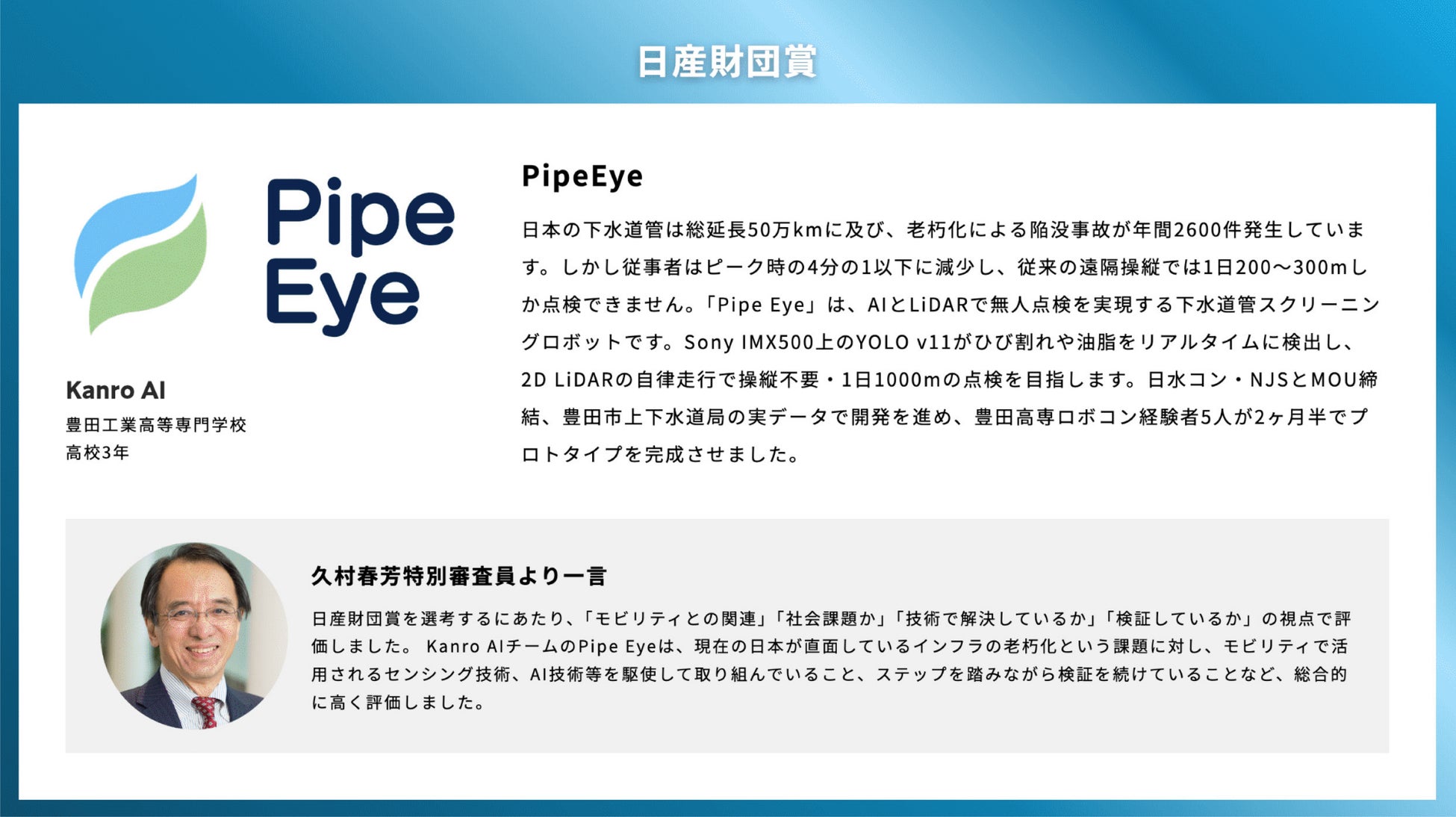 「昨年度の作品でも良い取り組みが増えていると感じましたが、今回も社会課題を的確にとらえたテーマ設定の面白さや、技術適用の視点の良い作品が多数見られました。