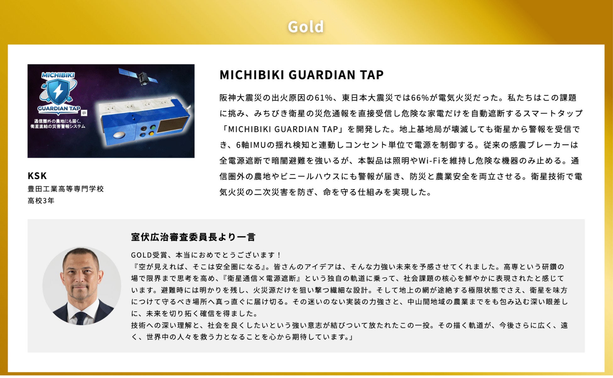 今年の最優秀賞は、豊田工業高等専門学校の「MICHIBIKI GUARDIAN TAP」に決定!