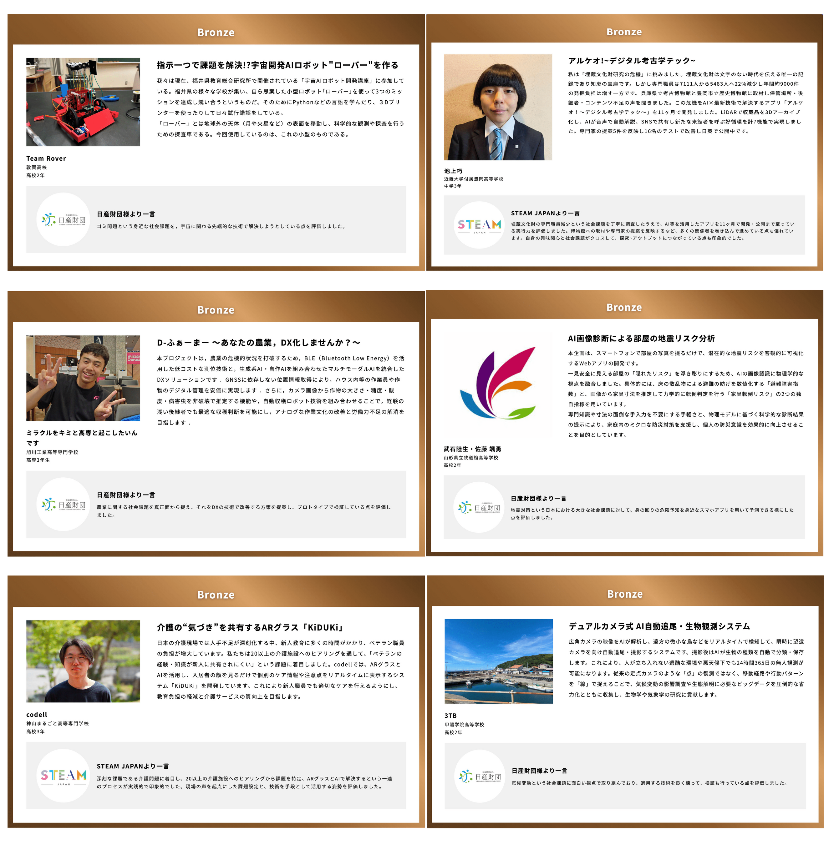 今回で6回目の開催となる本アワード(主催:STEAM JAPAN AWARD 実行委員会/協賛:公益財団法人 日産財団/後援:文部科学省)。今年も日本全国、そして海外からも多数のご応募をいただき、社会課題の解決に挑む意欲的なプロジェクトが数多く集まりました。 厳正な審査を経て、このたび各賞が決定いたしました。