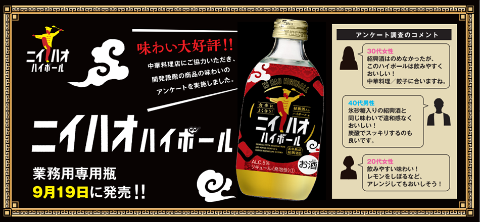 7月11日に発売しました市販用商品に続き、料飲店専用商品として、瓶入り商品を発売致します。中華料理店はもちろん、紹興酒の取り扱いのない居酒屋などでも手軽に楽しんで頂ける新しい切り口のお酒です!