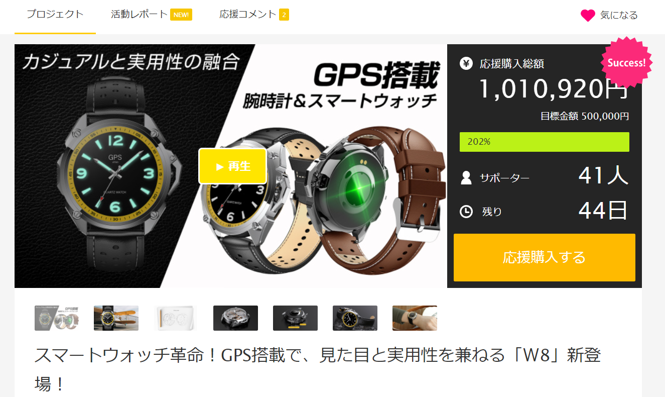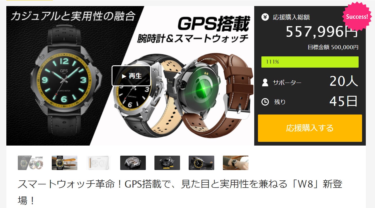 【スマートウォッチW8】がなんと公開が開始されわずか1時間で目標の50万円を達成することができました。