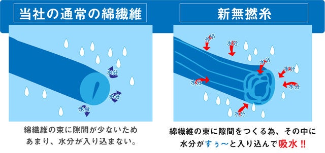 綿繊維の束にすき間を作るため、その中に水分が入り込みどんどん吸水!!