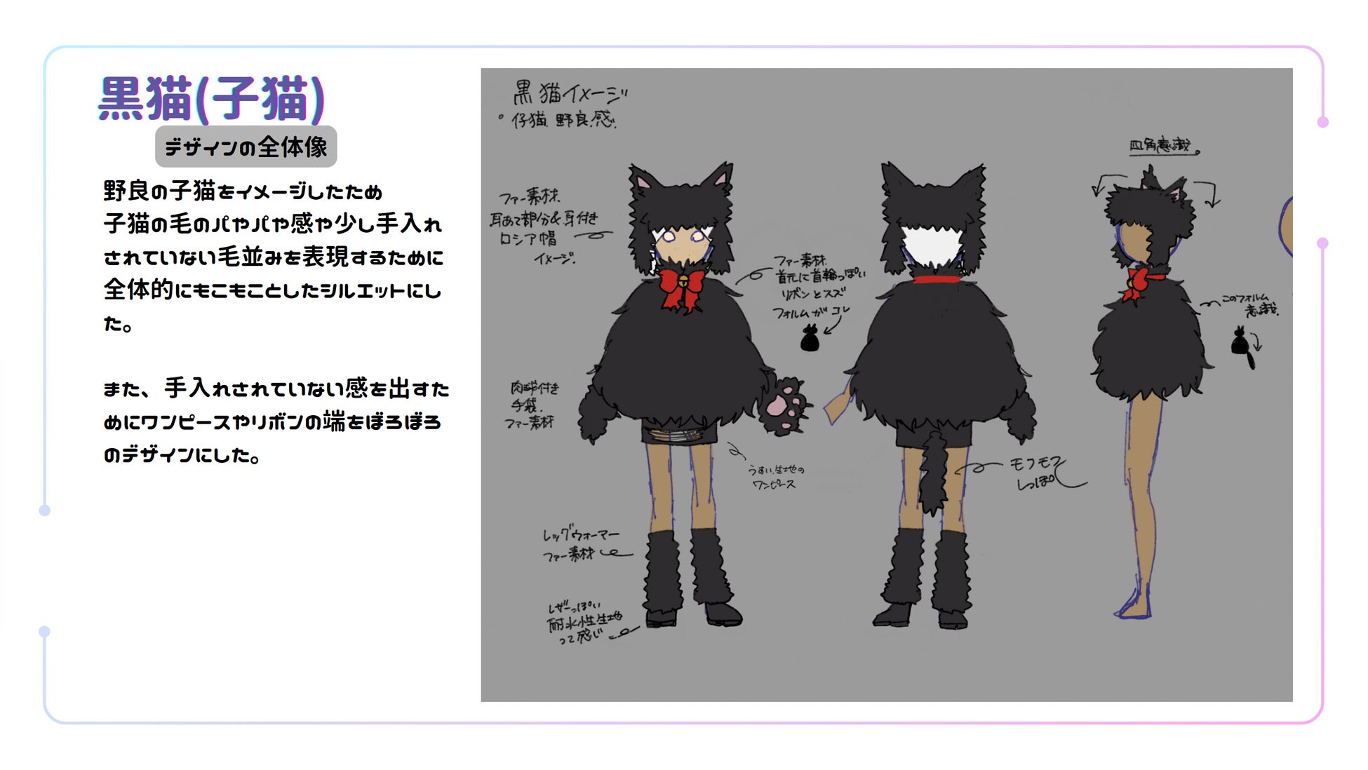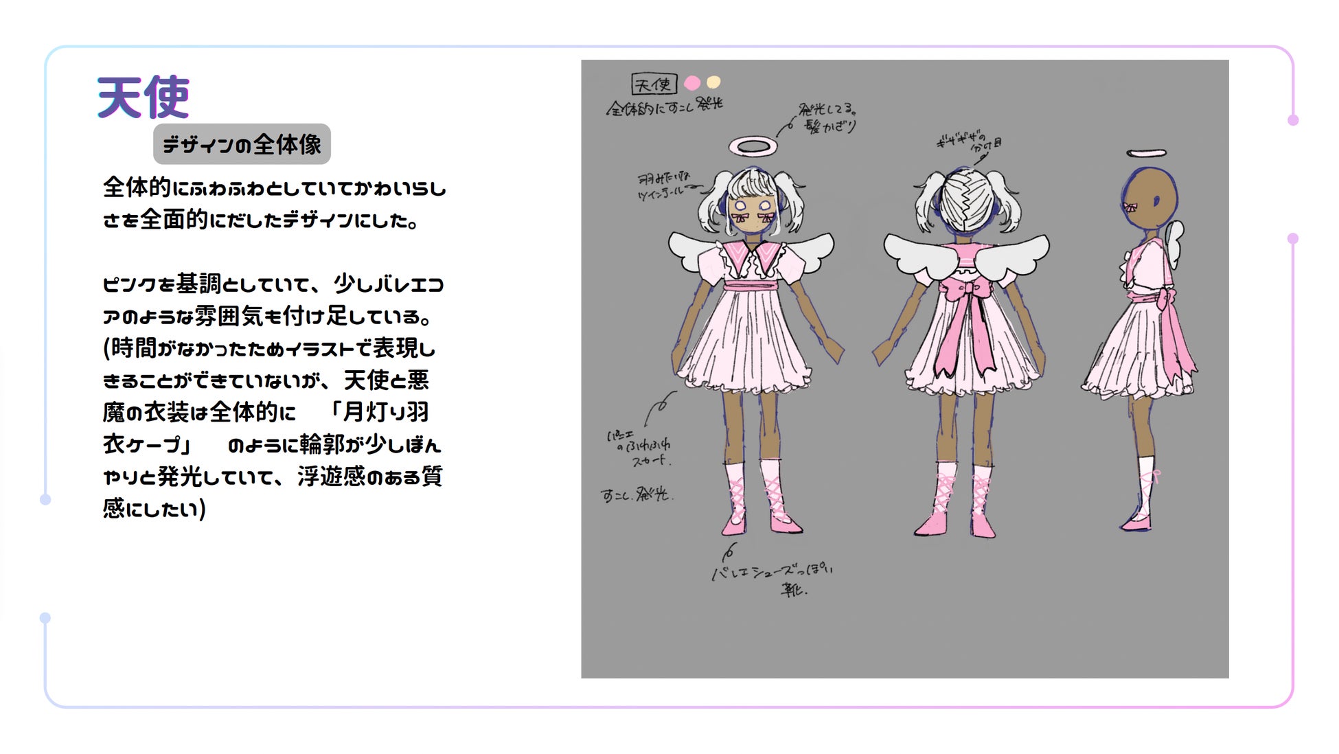 また、デザインを描き出す段階においては、将来仕事として取り組む際にも重要となる「コンテンツ自体のリサーチ」の必要性についても指摘がありました。今回でいえば「Sky」というゲームそのものを丁寧に調べ、どのようなアイテムが既に存在しているのかを把握しておくことで、「既存にはこのタイプが多いので、今回は別の方向性を提案したい」といった形で、より説得力のあるアプローチが可能になると助言しました。