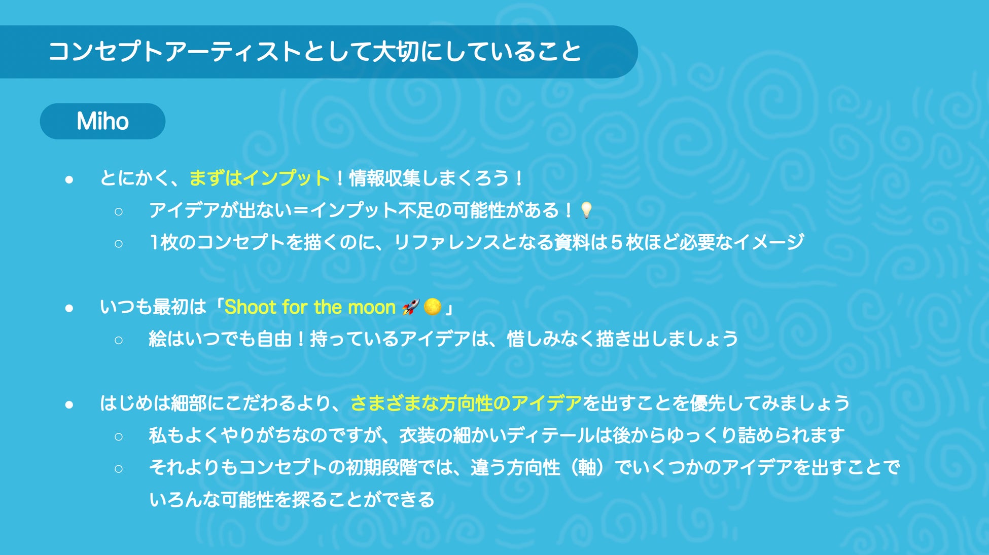 一方、藤原は制作初期に重視している点として、まず徹底したインプットと情報収集を行い、多くの材料からアイデアを選び取るプロセスの大切さを紹介しました。また、田邊から贈られた「Shoot for the moon」という言葉を引用し、絵づくりは常に自由であり、惜しみなく描き出す姿勢が創作の幅を広げると述べました。さらに、最初から細部にこだわりすぎず、多様な可能性を探るために幅広い方向性からアイデアを試すことを心がけていると語りました。
