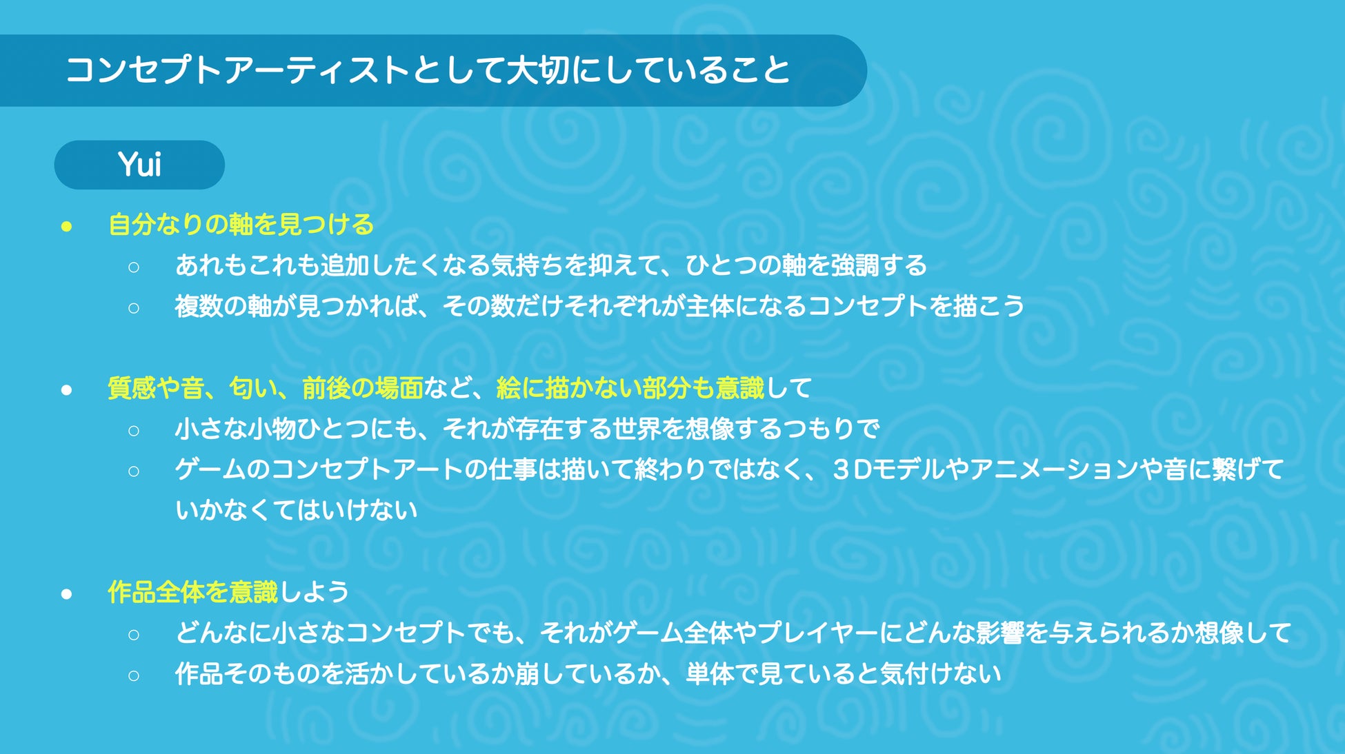 後半の時間では、田邊と藤原が「コンセプトアーティストとして日頃大切にしていること」について紹介しました。