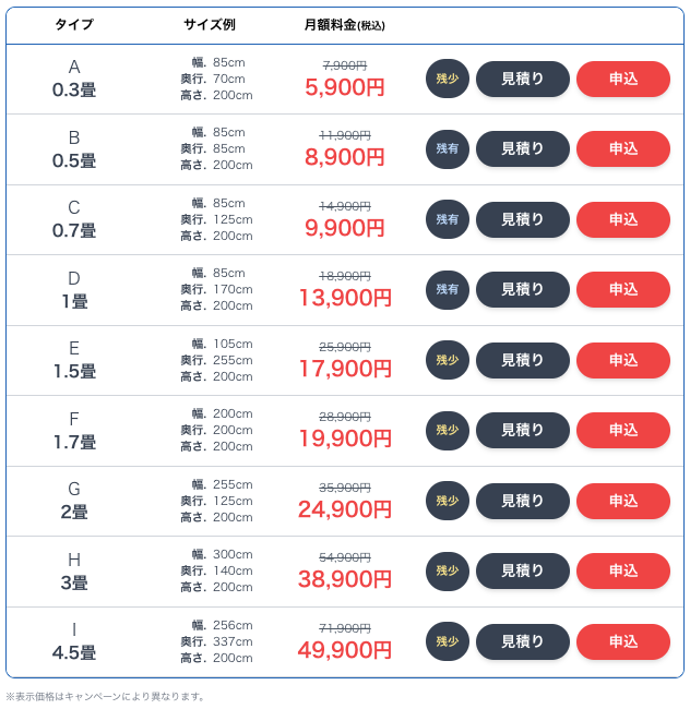 - 部屋タイプとサイズ、月額料金はこちら