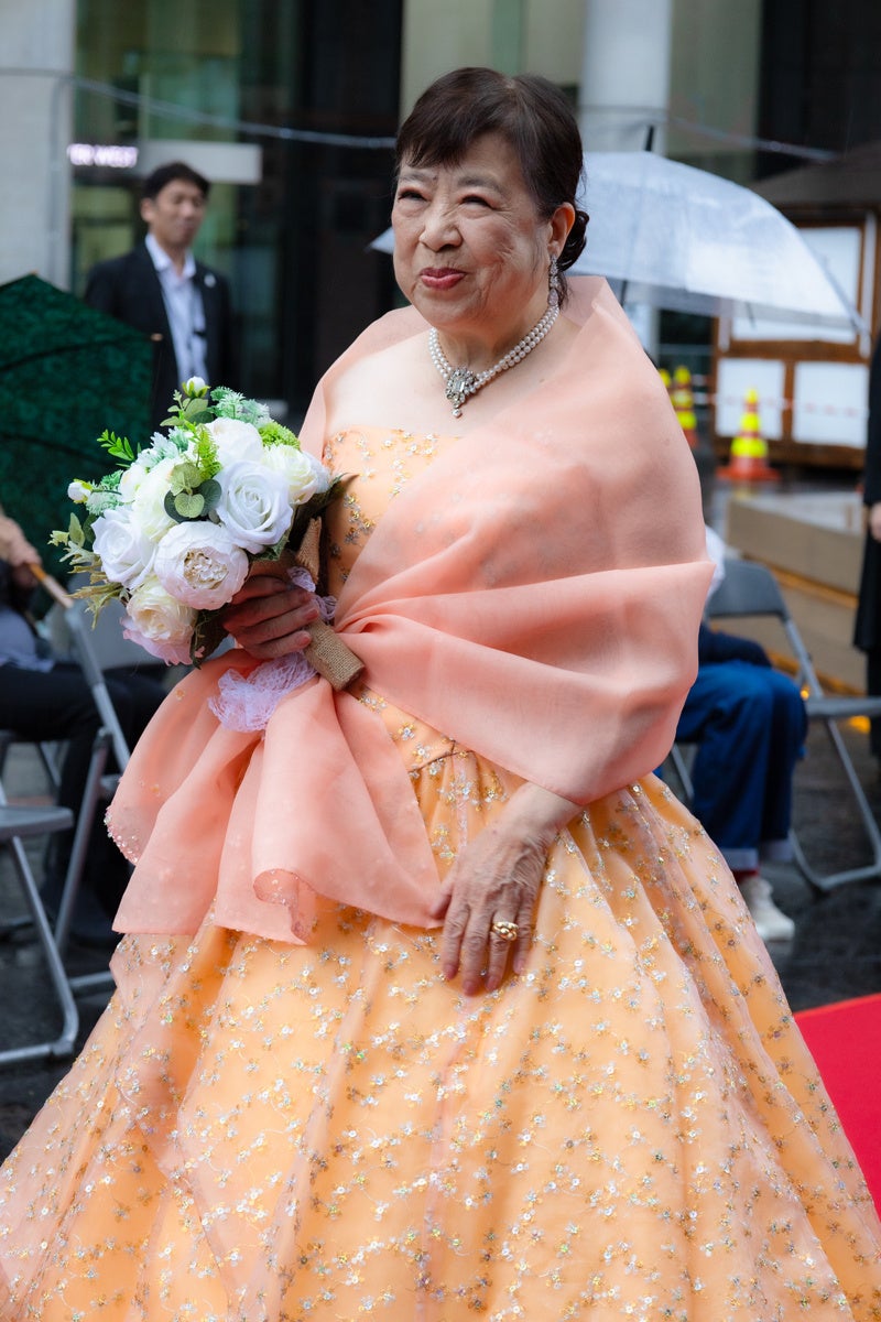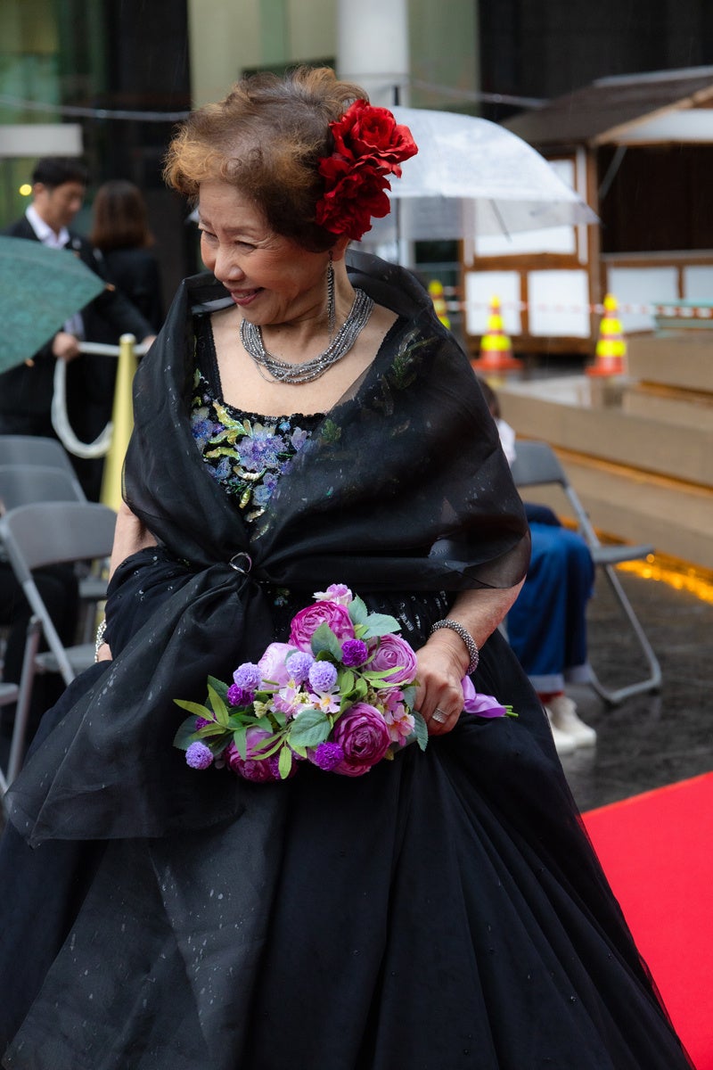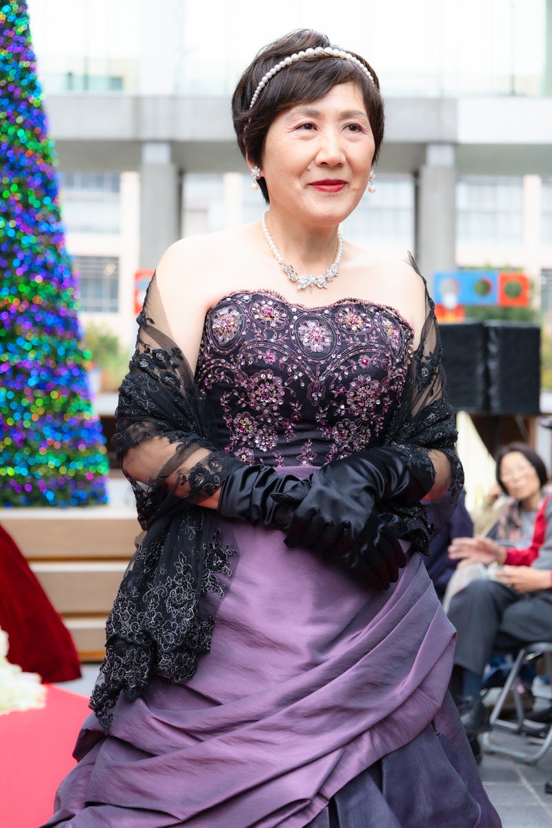 高貴なイメージで紫のドレスを選んだという越谷さんは結婚式の淡いピンクから今の年齢でこそ着こなせる色にチャレンジし、「孫の七五三にはまけないよ!」と元気にランウェイを歩かれました。