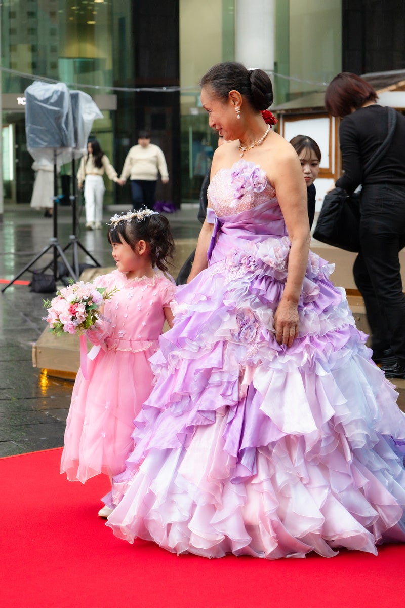 ピンクのドレス姿のプリンセスのようなお孫さんのいとかちゃんと一緒にランウェイに登場した芝崎さんもパステルカラーのドレスに身を包み、華やかなペアコーディネートでした。