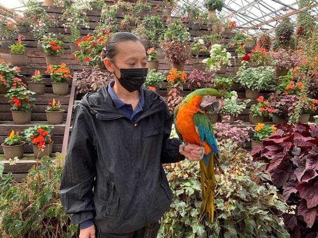 富士花鳥園の冬休み企画:オオハナインコちゃんたちにおやつをあげて、ハルクコンゴウインコのハル君を腕にのせよう!
