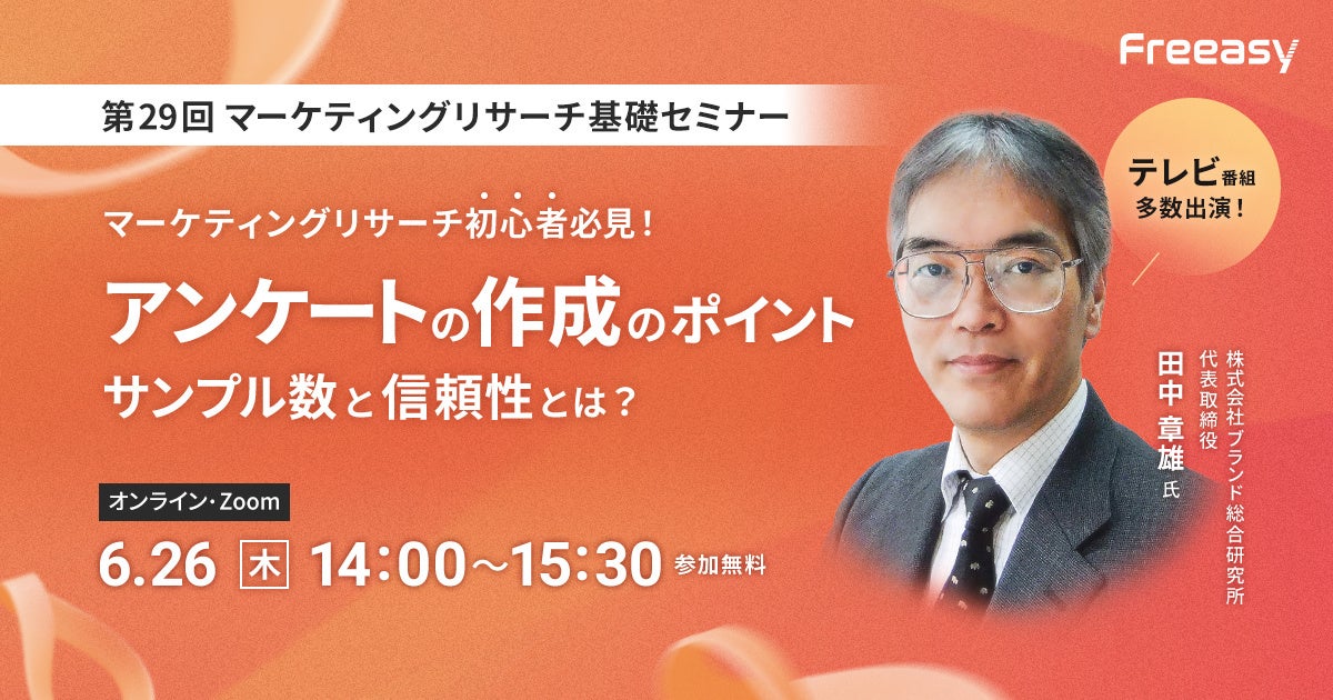 全国1,300万人の調査モニターへ、500円からネットリサーチが実施できる、セルフ型アンケートツール“Freeasy(フリージー)”を展開するアイブリッジ株式会社(本社:大阪市福島区、代表取締役社長:荒川和也)は、『第29回 マーケティングリサーチ基礎セミナー「アンケートの作成のポイント-サンプル数と信頼性とは?-」』を、2025年6月26日(木)14時から開催いたします。