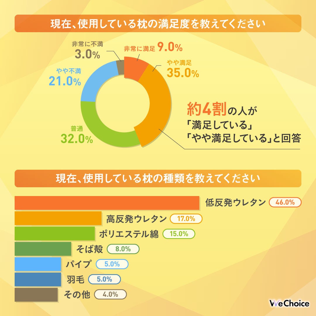 現在使用している枕について、「満足している」「やや満足している」と回答した人は約4割にとどまりました。