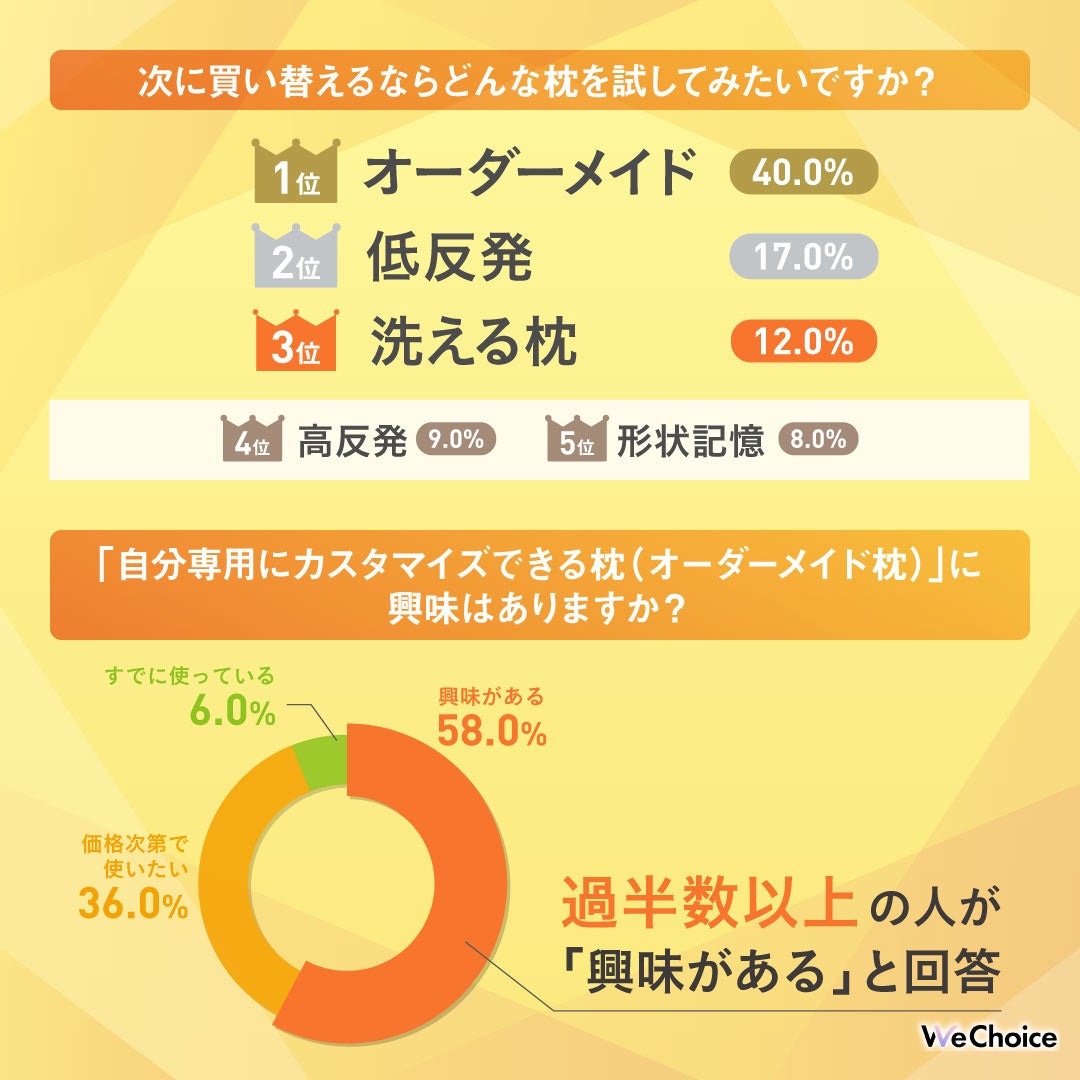 一方で「すでに使っている」という人は6%にとどまり、オーダーメイド枕に対する期待は高いものの、価格がネックになっている現状も見えてきました。