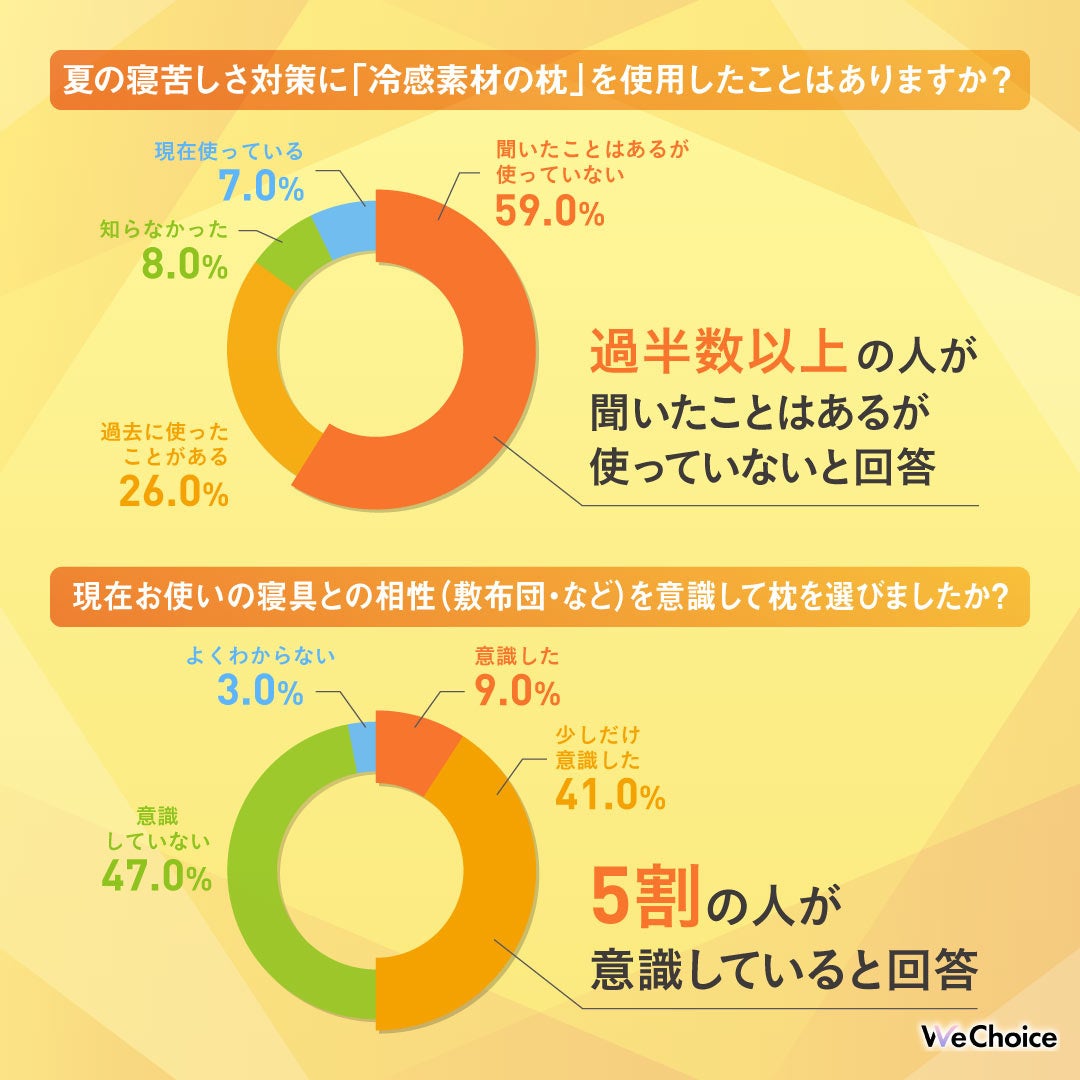 【夏の寝苦しさ対策に「冷感素材の枕」を使ったことはありますか?/現在お使いの寝具との相性(敷布団・など)を意識して枕を選びましたか?】