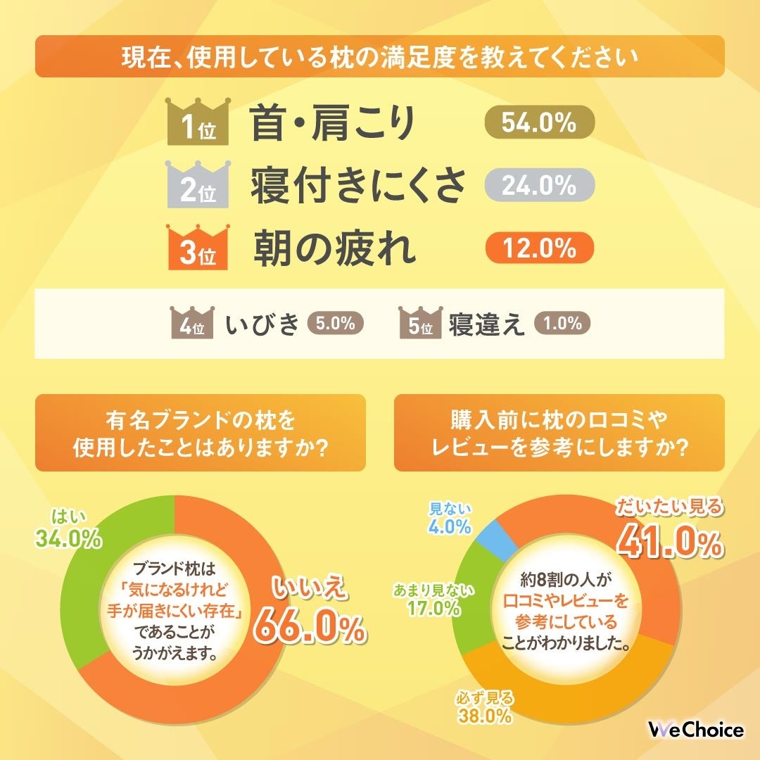 首・肩の不調などの不調を訴える方が多い一方で、有名ブランドの枕を使ったことがある人は34%にとどまり、66%の人は「ブランド枕未経験」という結果となりました。