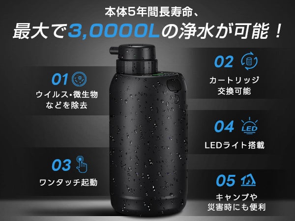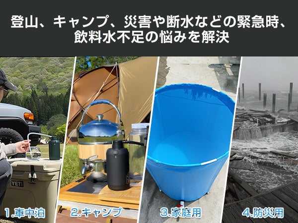 1.自然の水を、飲用可能な水に変えることのできるデバイスが、クラウドファンディングサイトにて先行発売致します。水源から1メートル離れた場所から、リチウムバッテリー駆動で自動的に取水が出来るので、非常に便利な上に、安全です。
