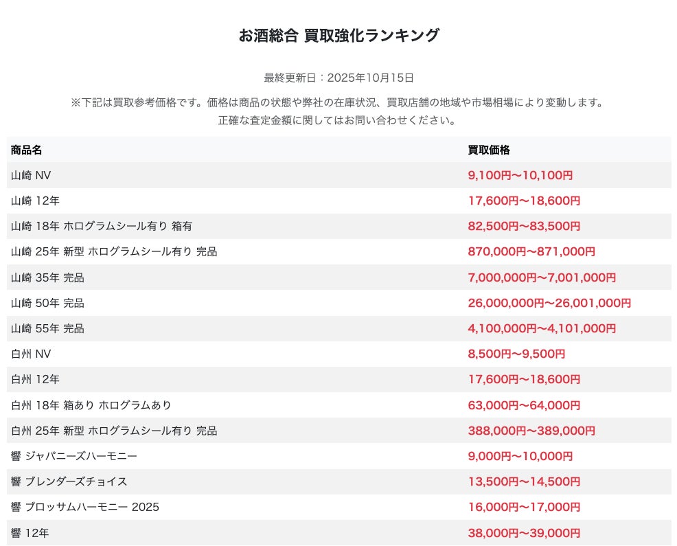 リユース事業を行うストックラボ(本社:東京都新宿区新宿2-12-16 セントフォービル203)は、この度、公式サイト内に掲載している「お酒総合 買取強化ランキング」セクションにおける各銘柄の買取参考価格について、毎日自動で金額を更新するシステムを導入したことをお知らせいたします。