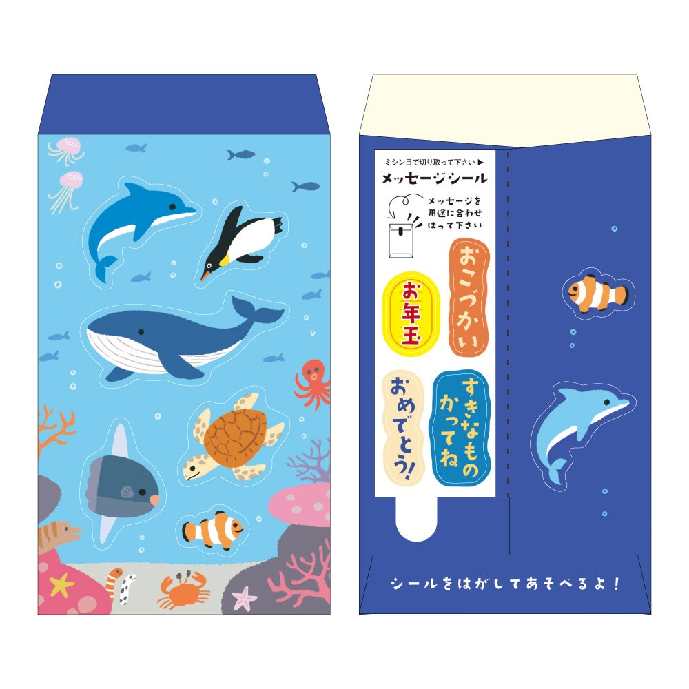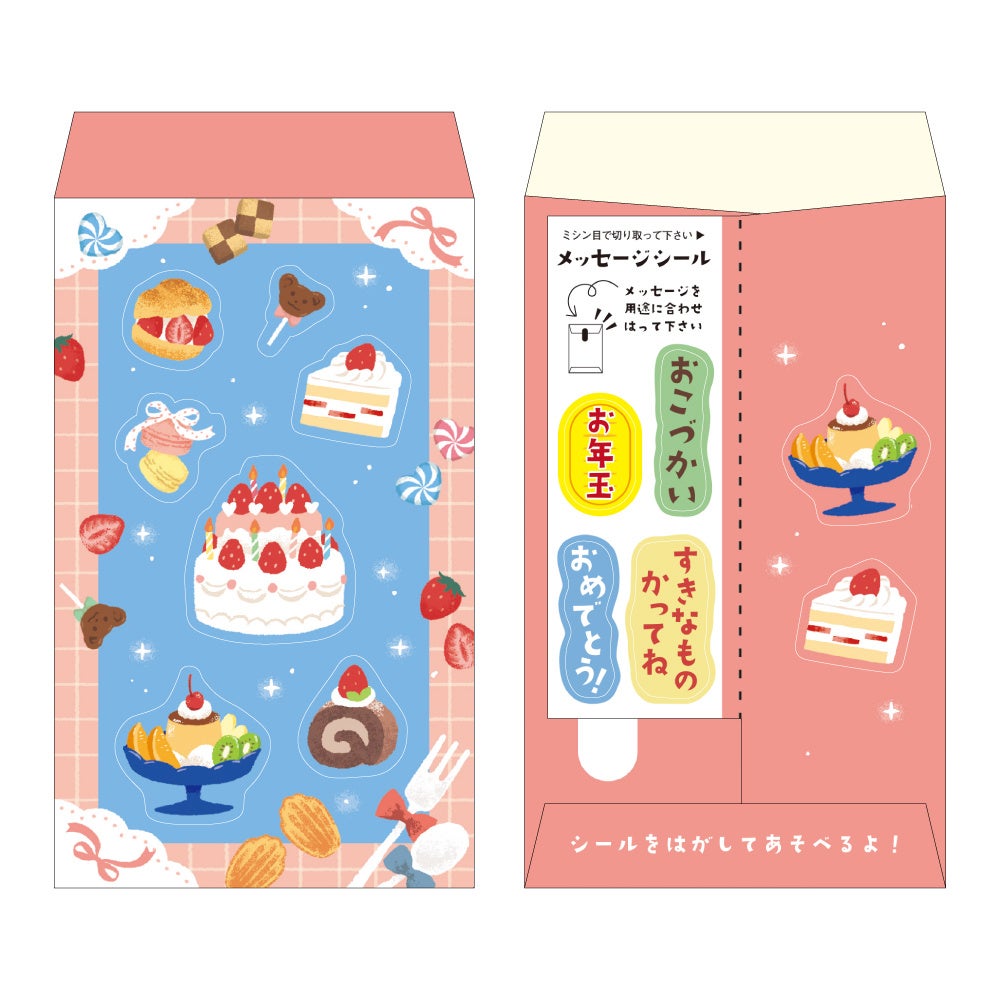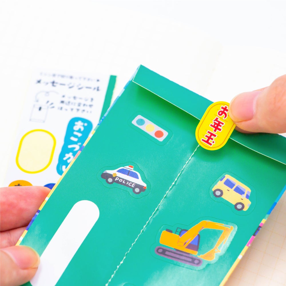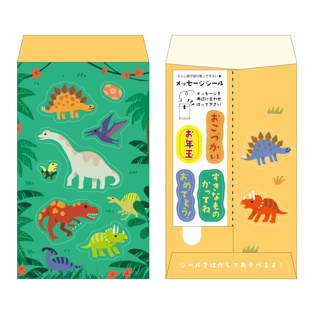 裏面にはメッセージシールが付属しており、「お年玉」「お祝い」「おこづかい」と選ぶシールによって1年を通じて様々なシーンに合わせてご使用いただけます。