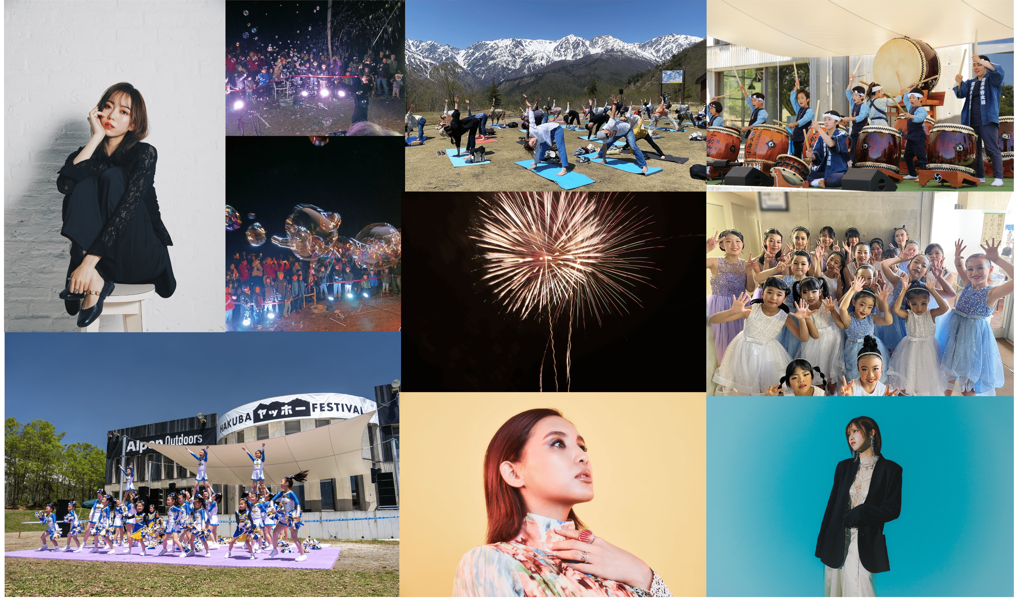 この度、標高約1,300mの絶景空間で、5月16日(土)・17日(日)に実力派アーティストが出演するオープニングアクトや、信州小谷太鼓、チアリーディングなど地元のチームも出演するオープニングイベントなどの実施が決定しました。新緑が美しい5月の白馬で、朝はヨガ、昼はライブ、夜は花火と、1日中五感を刺激する今しかできない体験をご提供いたします。