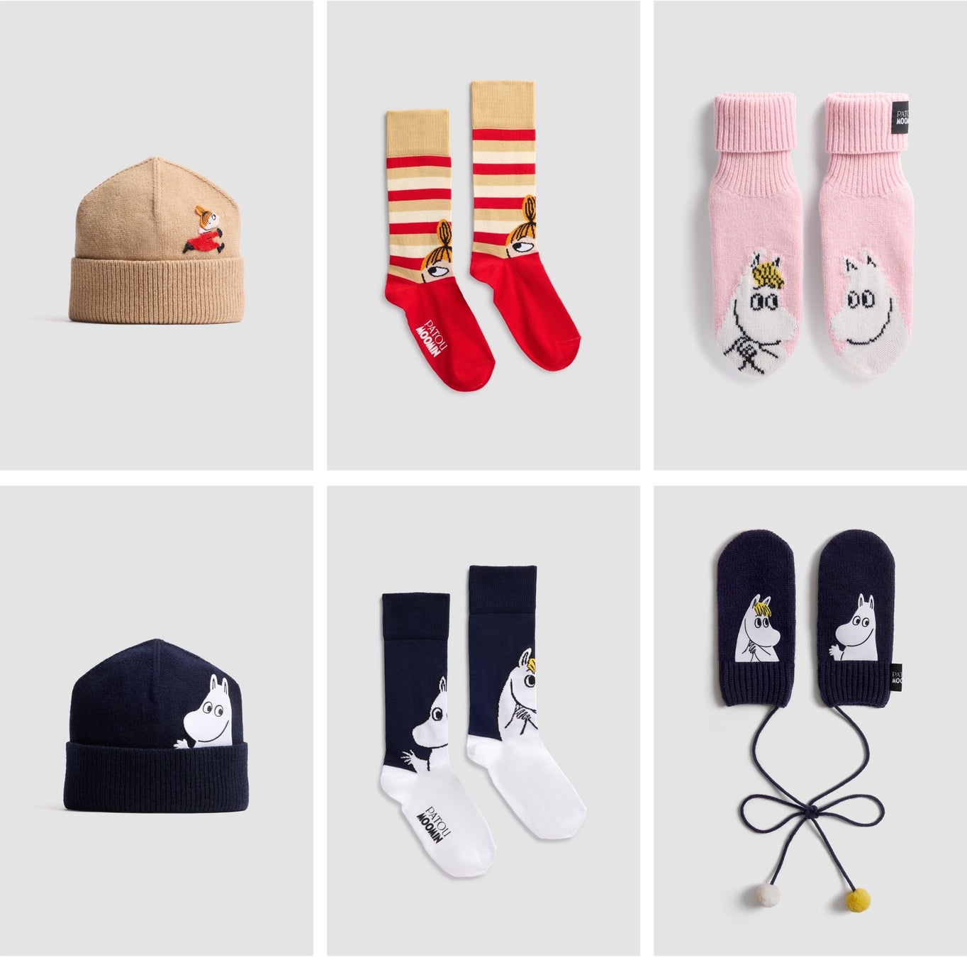 このコレクションでは柔らかなニット帽、ビーニー、柄ソックス、アクセサリーなど、冬の必需品をラインアップ。リトルミイはアイコンバッグ「Le Petit Patou」のワッペンとして登場します。