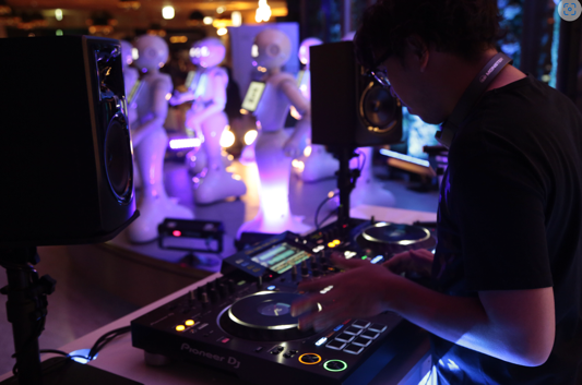 ネオンで照らされたムーディーな店内にて毎日午後8時30分~開催されるPepperのシンクロダンスパフォーマンスは必見!Pepperのキュートな踊りだし合図にもご注目ください。