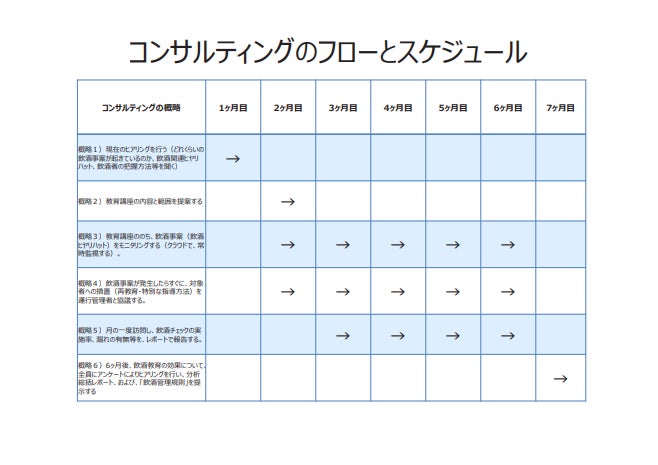 この度当社が認定された教育コンサルメニューは、約半年かけて、AUDITの実施からアルコールの基礎講座や、アルコール検知器のデータ分析、教育資料の維持管理等を、持続性・継続性のある「かたち」として構築を支援する内容です。アルコール検知器をただ使っているだけでは飲酒運転は根絶できないということを、社として定着させるお手伝いを致します。