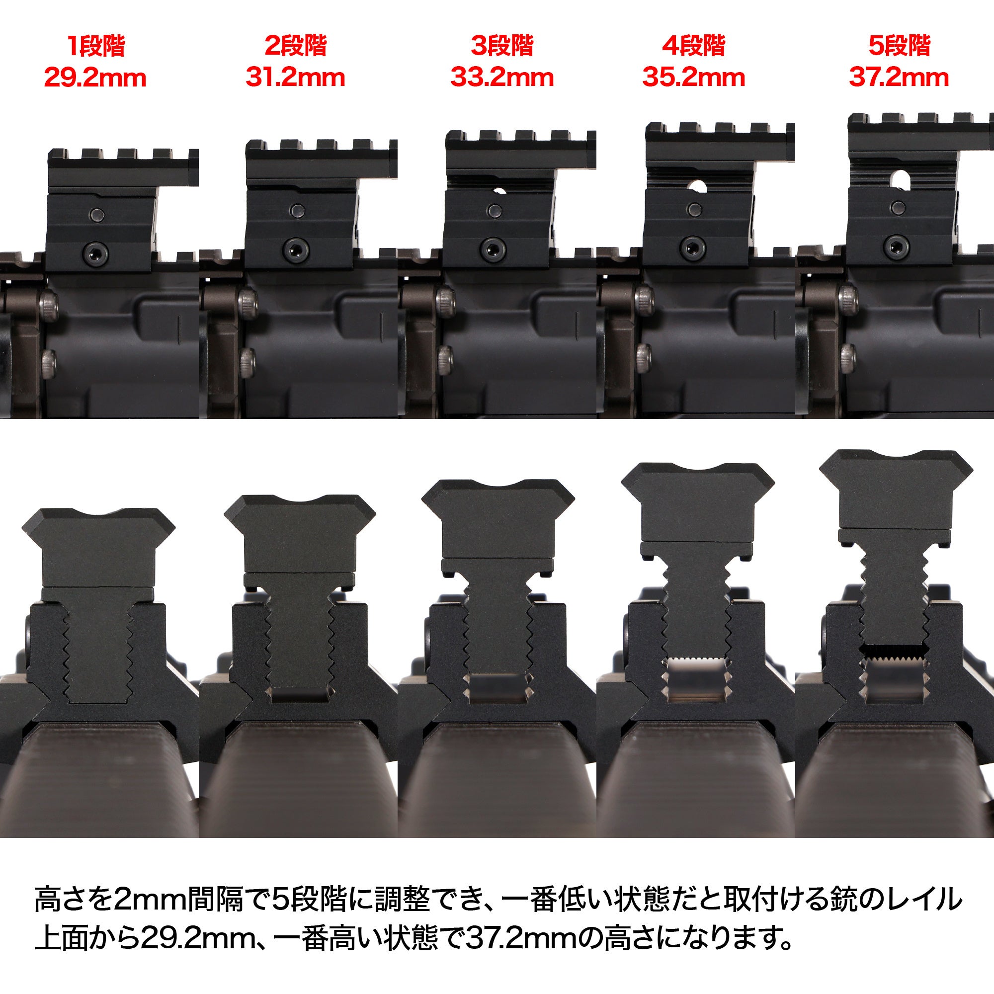 サイト位置の調整、レイル長の変更、外観カスタム。あらゆる目的で使えるアジャスタブルハイマウントは、サバゲー愛好家からお座敷シューターまで幅広いユーザーが楽しめる拡張アイテムです。