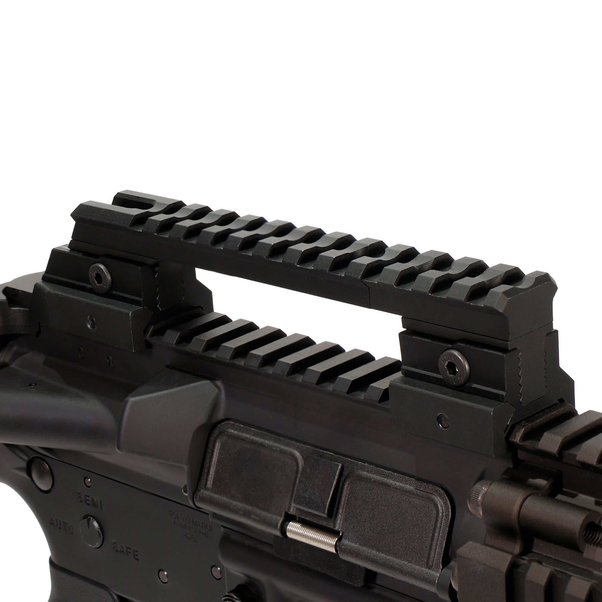 アッパーレシーバー上での視認性向上、光学機器の最適化、外観カスタムの両立を狙うユーザーに向けた多機能ハイマウント。高さは2mm刻みの5段階で調整でき、全長も3パーツ構成で自在に変更可能。近代的なキャリングハンドルの造形を取り入れたデザインは、ミリタリーファンからサバゲー初心者まで幅広い層にフィットします。